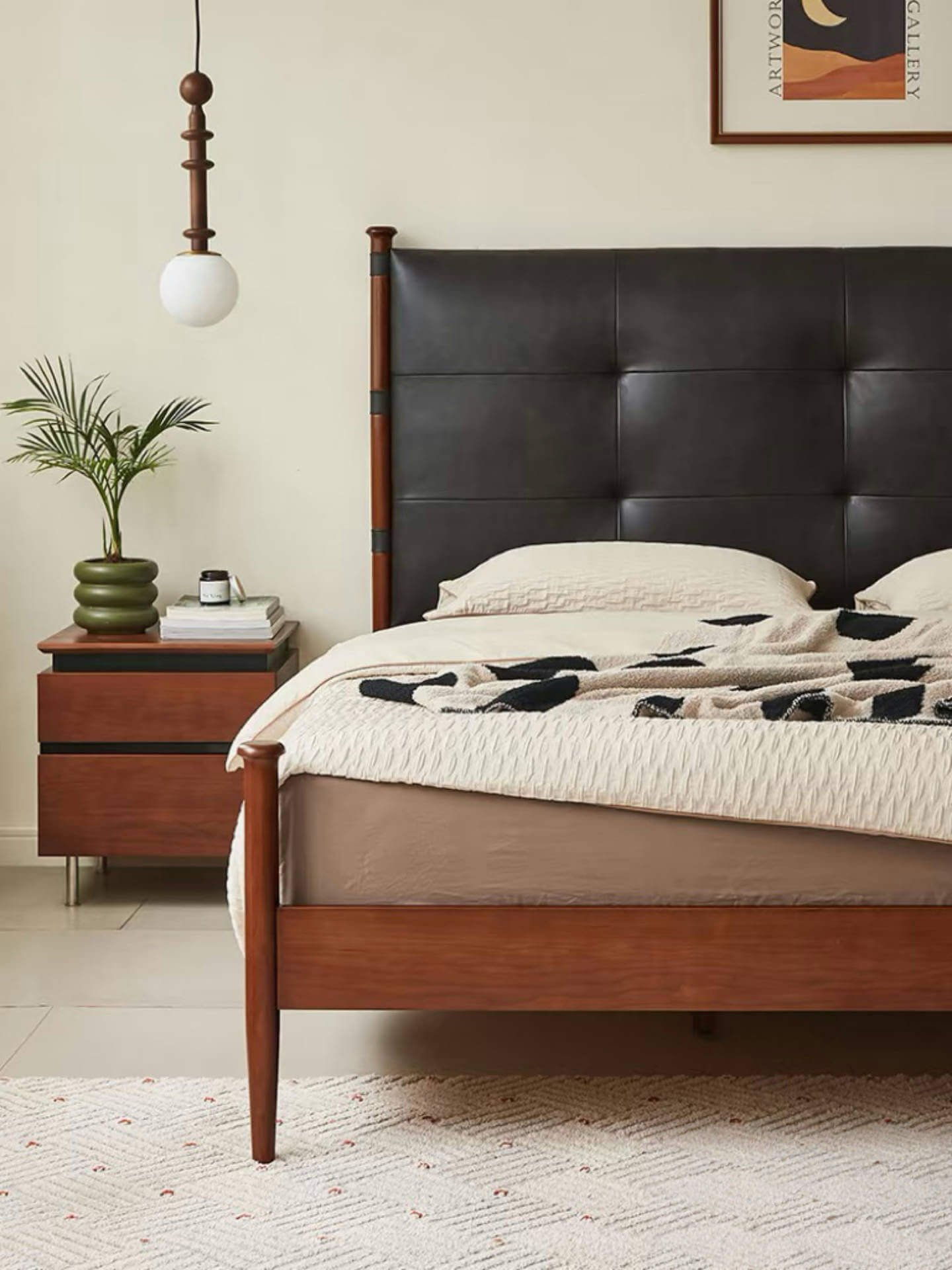 The bed features solid wood pillars at both ends, inspired by the scepter of a British queen in the Victorian era. They stand like loyal knights, guarding dreams and keeping out the world’s chaos. This design adds grandeur and a touch of vintage romance to the space.