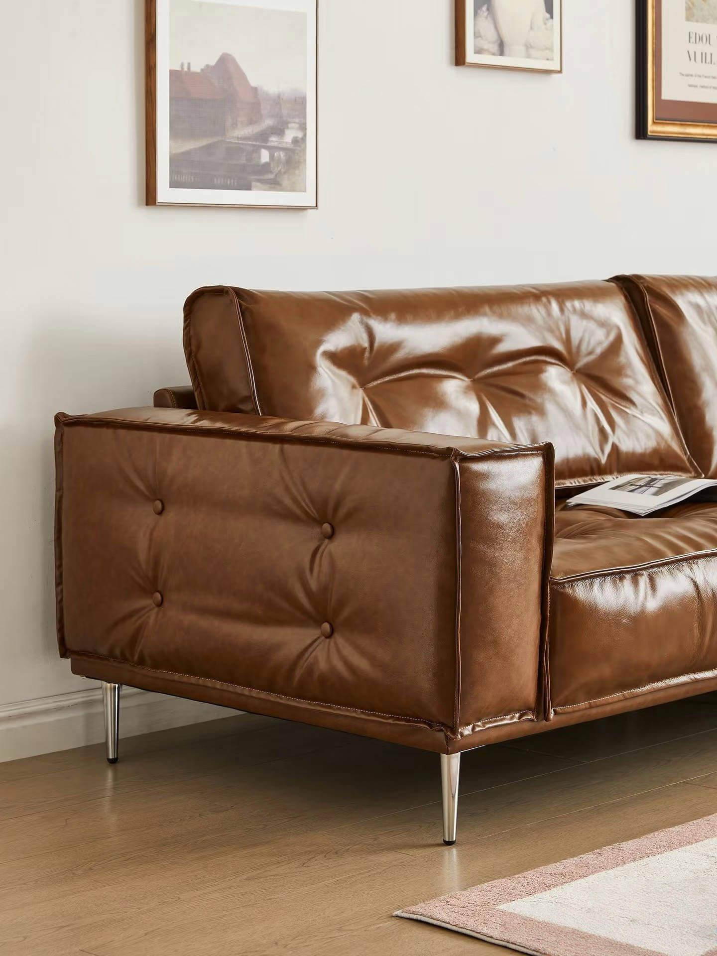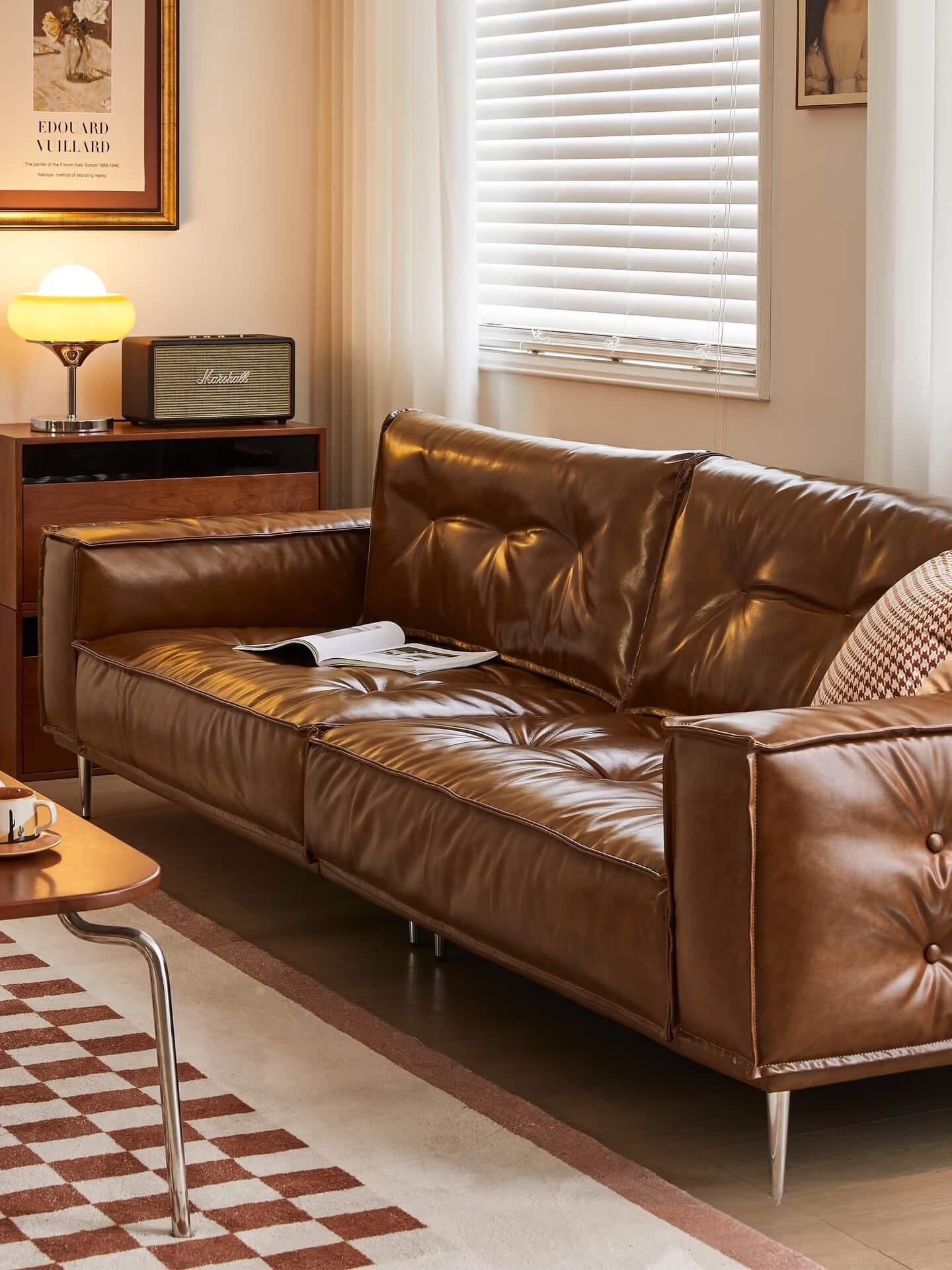 Crafted with premium oil-waxed leather, the sofa offers a supple, skin-like texture that feels soothing to the touch. It’s designed to melt away stress and fatigue, inviting you to unwind after a long day.