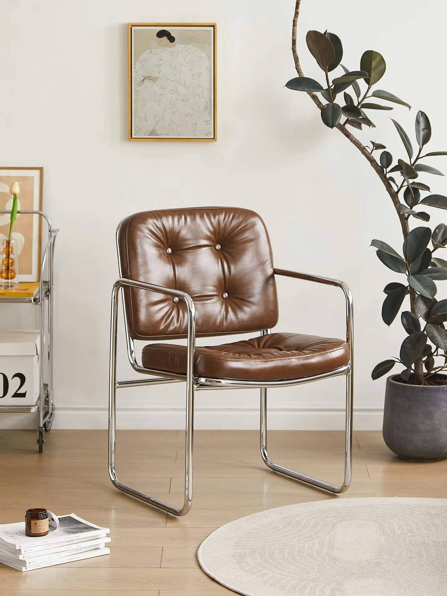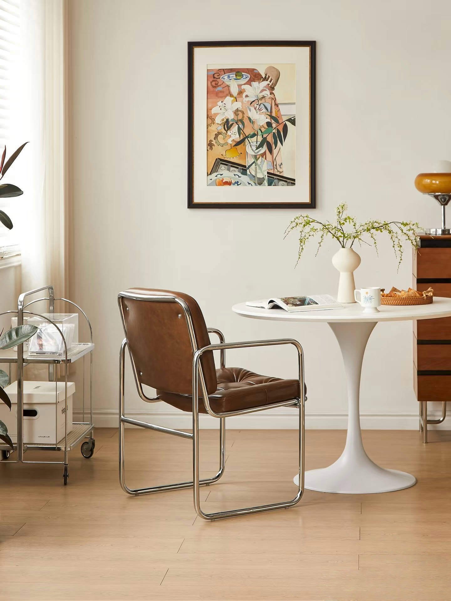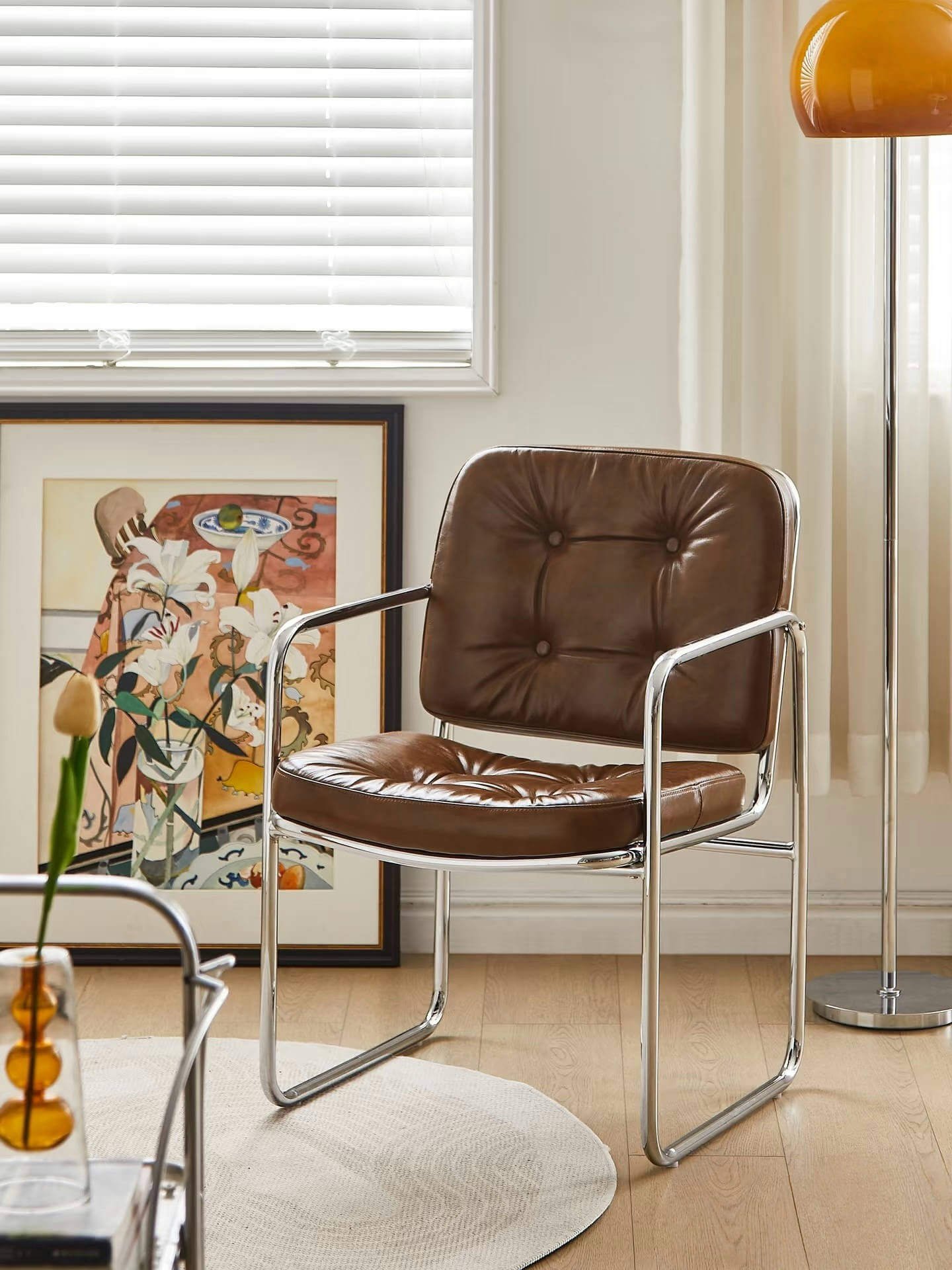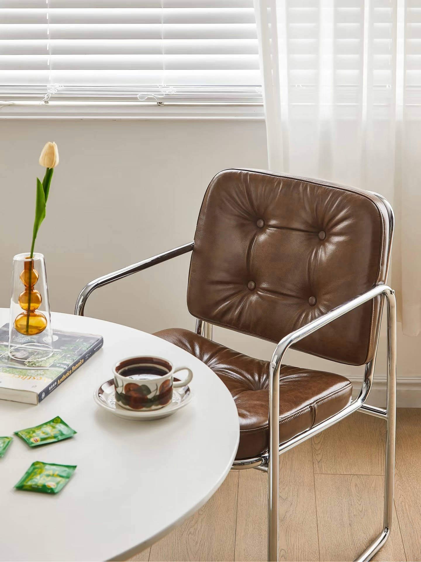 This vintage dining chair is a masterpiece of classic and modern design. The combination of retro oil-waxed leather and stainless steel creates a unique visual effect. The soft, rounded lines of the oil-waxed leather perfectly offset the cold, hard texture of the stainless steel, giving the chair a gentle, unobtrusive warmth. This material pairing not only offers visual comfort but also provides an unparalleled tactile experience. When you sit on this chair, you can feel the blend of timeless charm and modern craftsmanship.