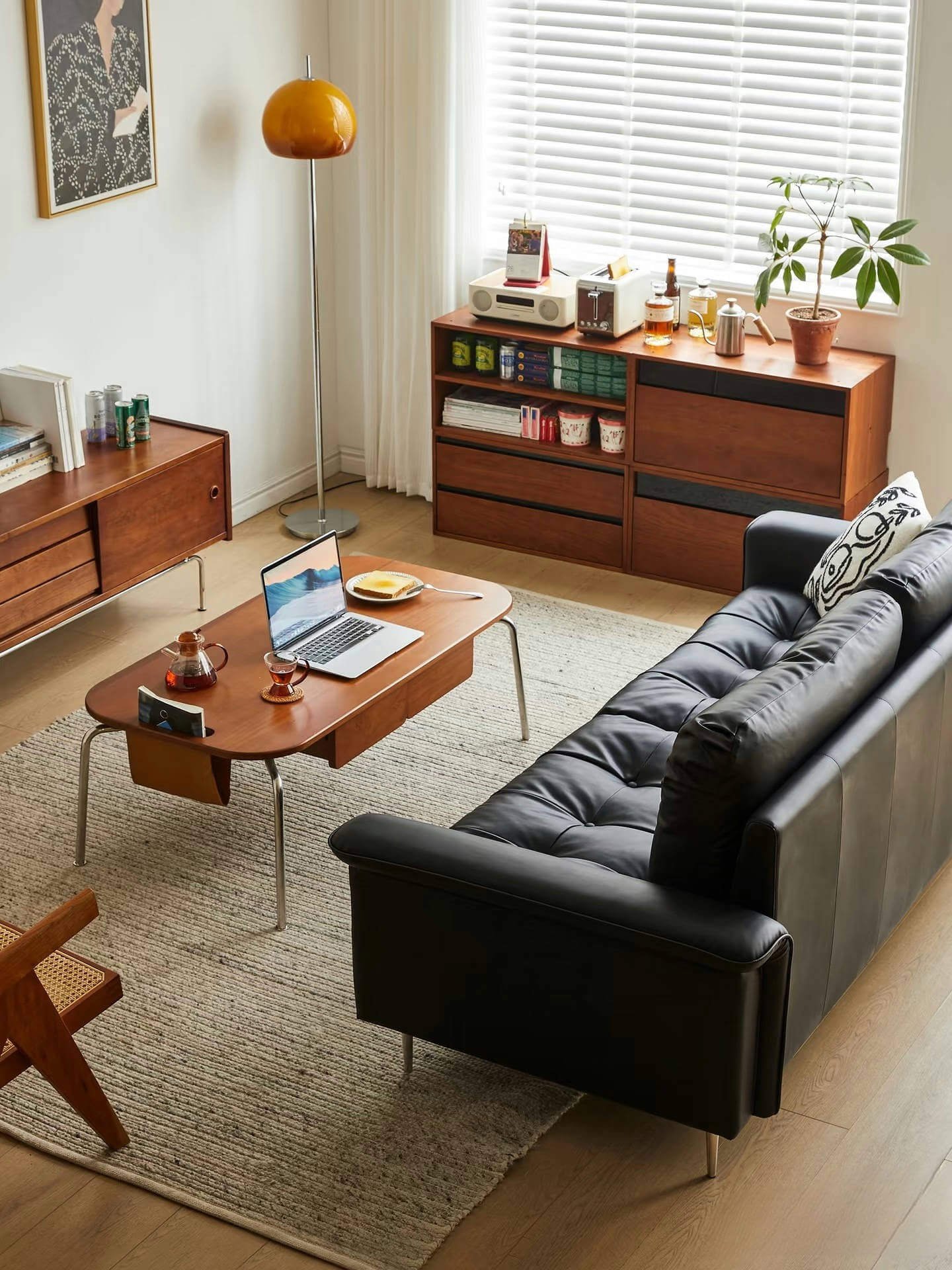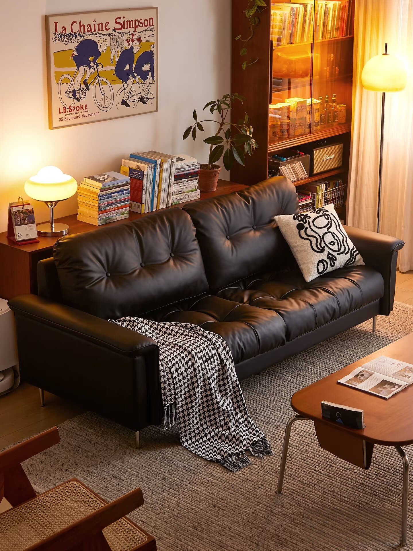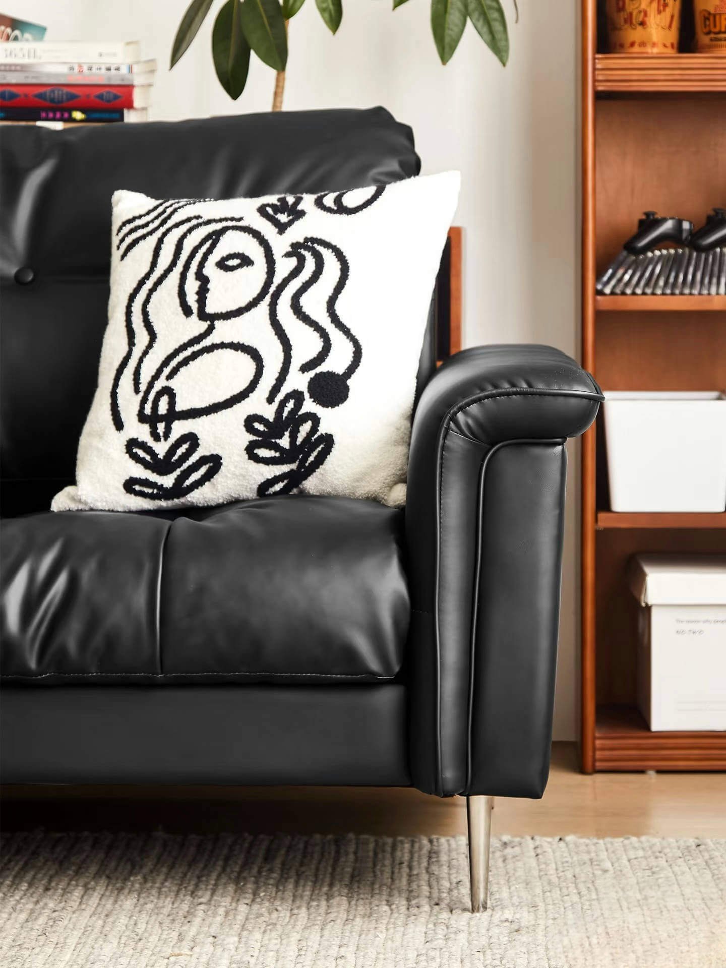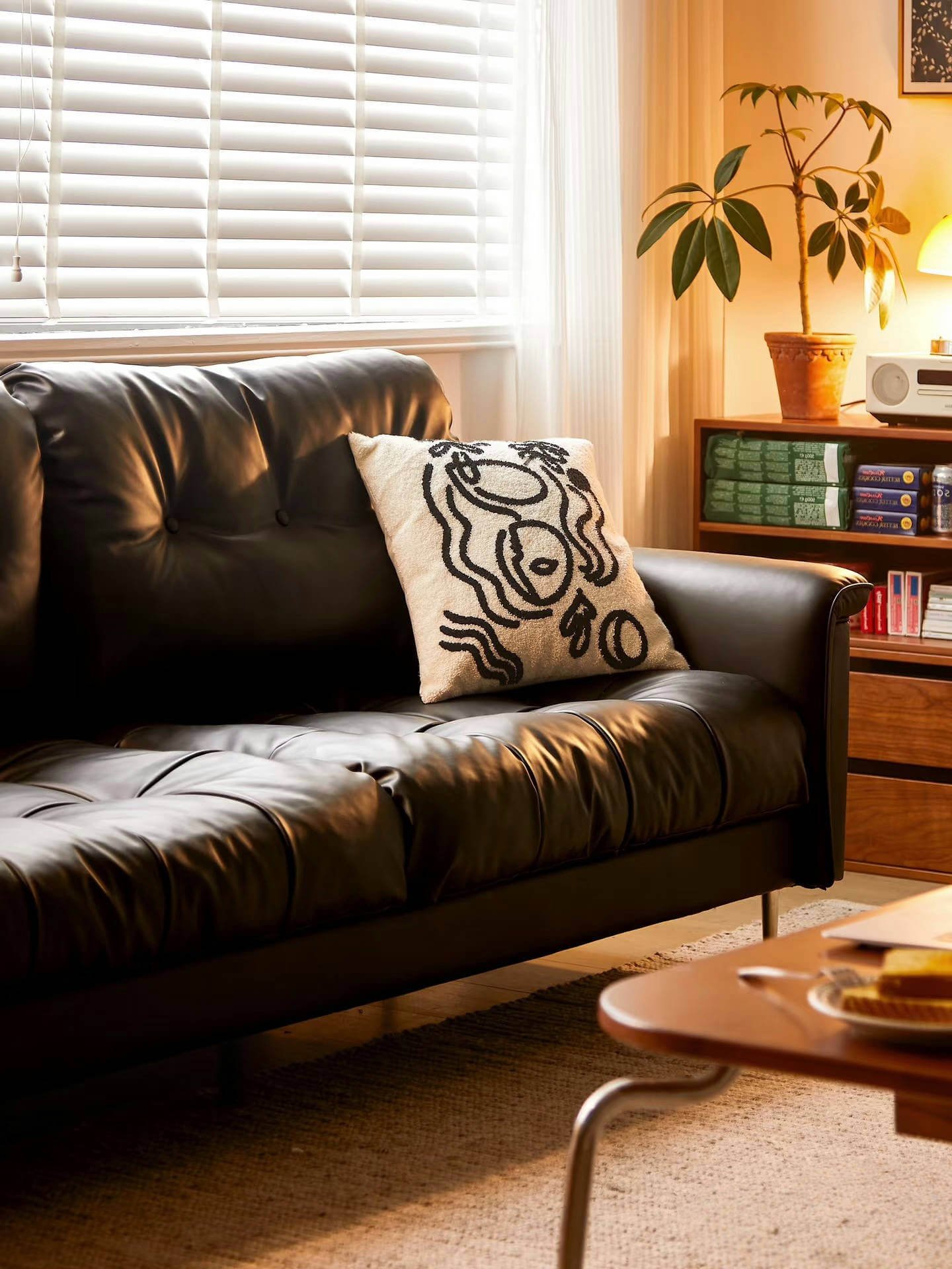 When black and brown intertwine as the room’s main tones, an atmosphere of nostalgic charm emerges. The Memory Sofa strikes a perfect balance with its simple yet versatile silhouette, effortlessly anchoring both minimalist modern and vintage styles. The matte black leather casts a subtle glow under the lights, like an open family photo album, documenting every memorable moment of daily life.