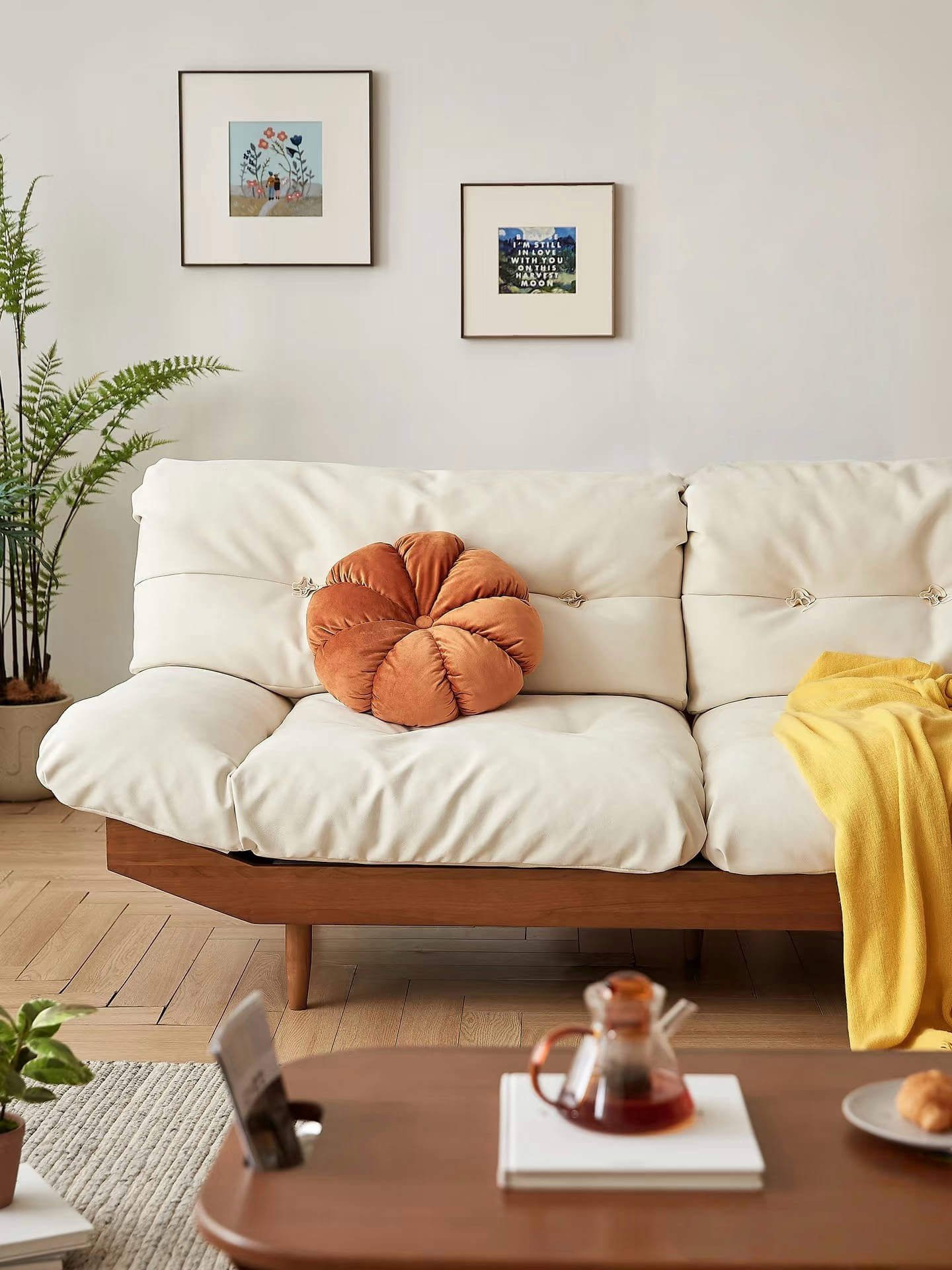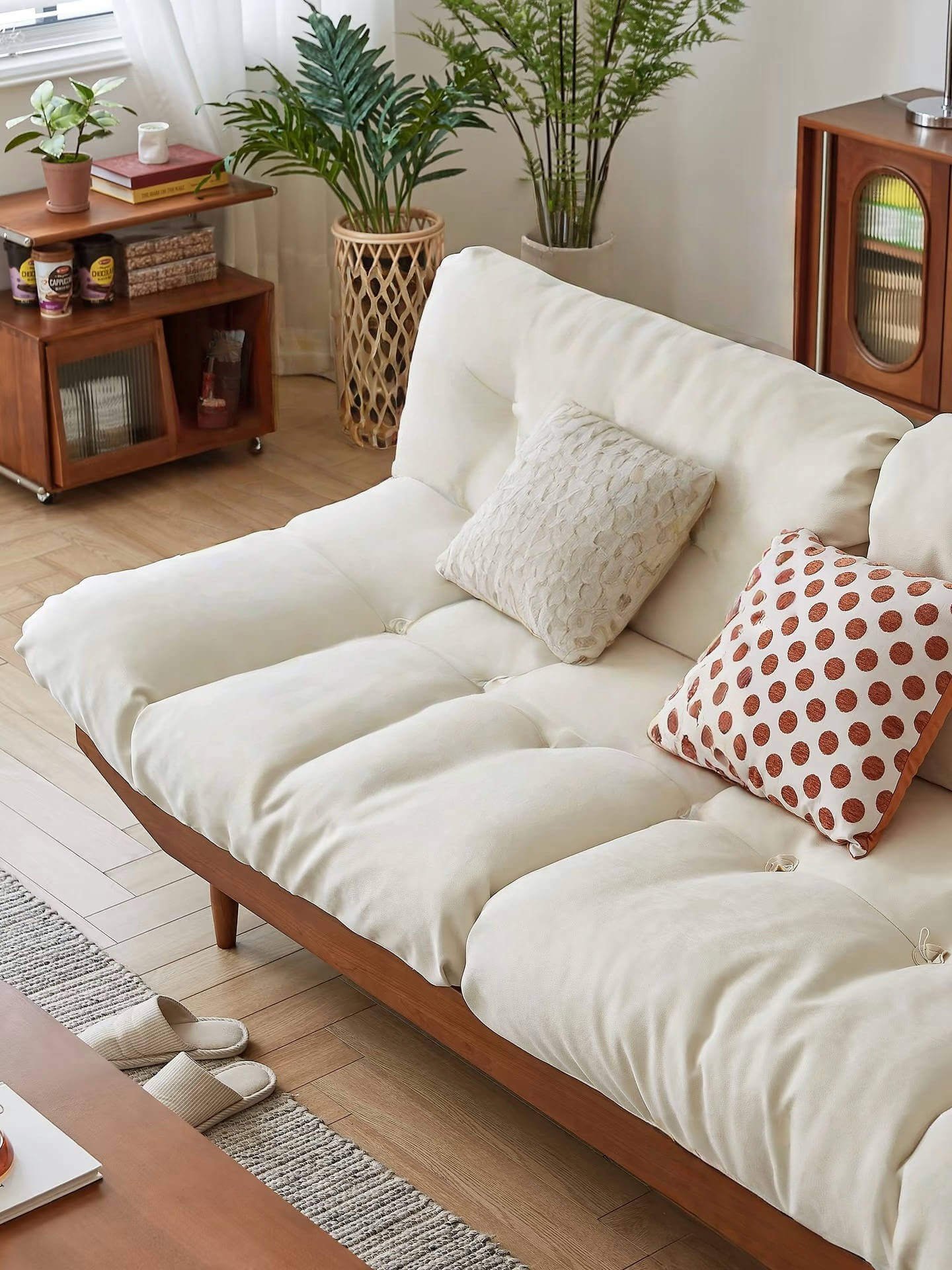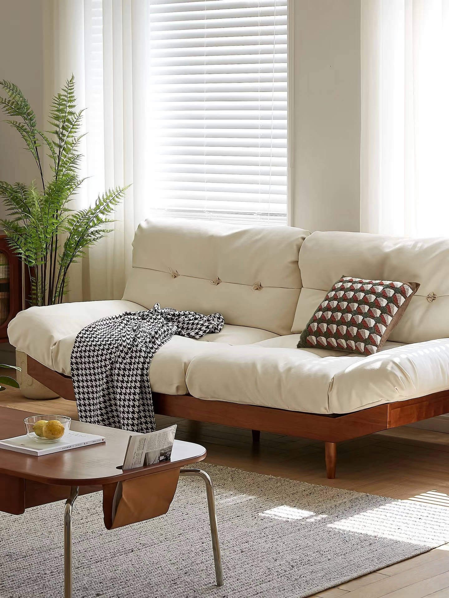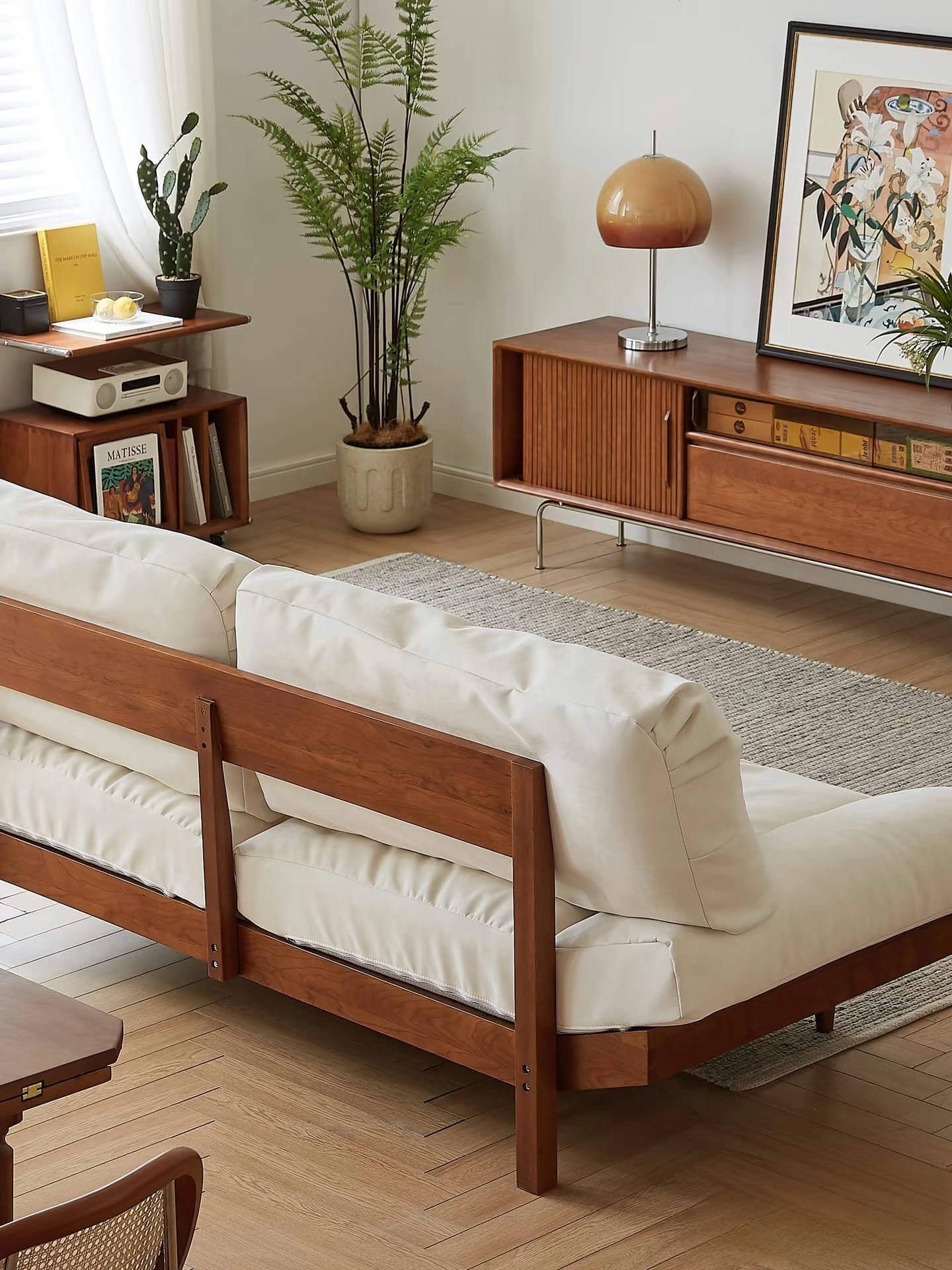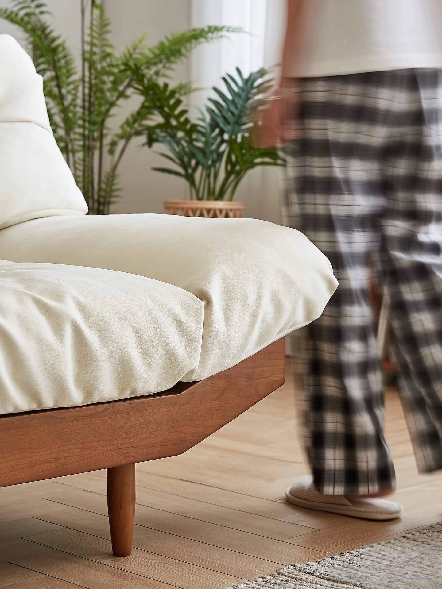 Crafted from North American cherry wood, this sofa marries creamy softness with the timeless warmth of vintage-toned solid wood. The result? A piece that’s both gentle and grounded, a visual anchor for any living space. The frame’s 360-degree elegance means it commands attention even when freestanding, offering sophistication from every angle.