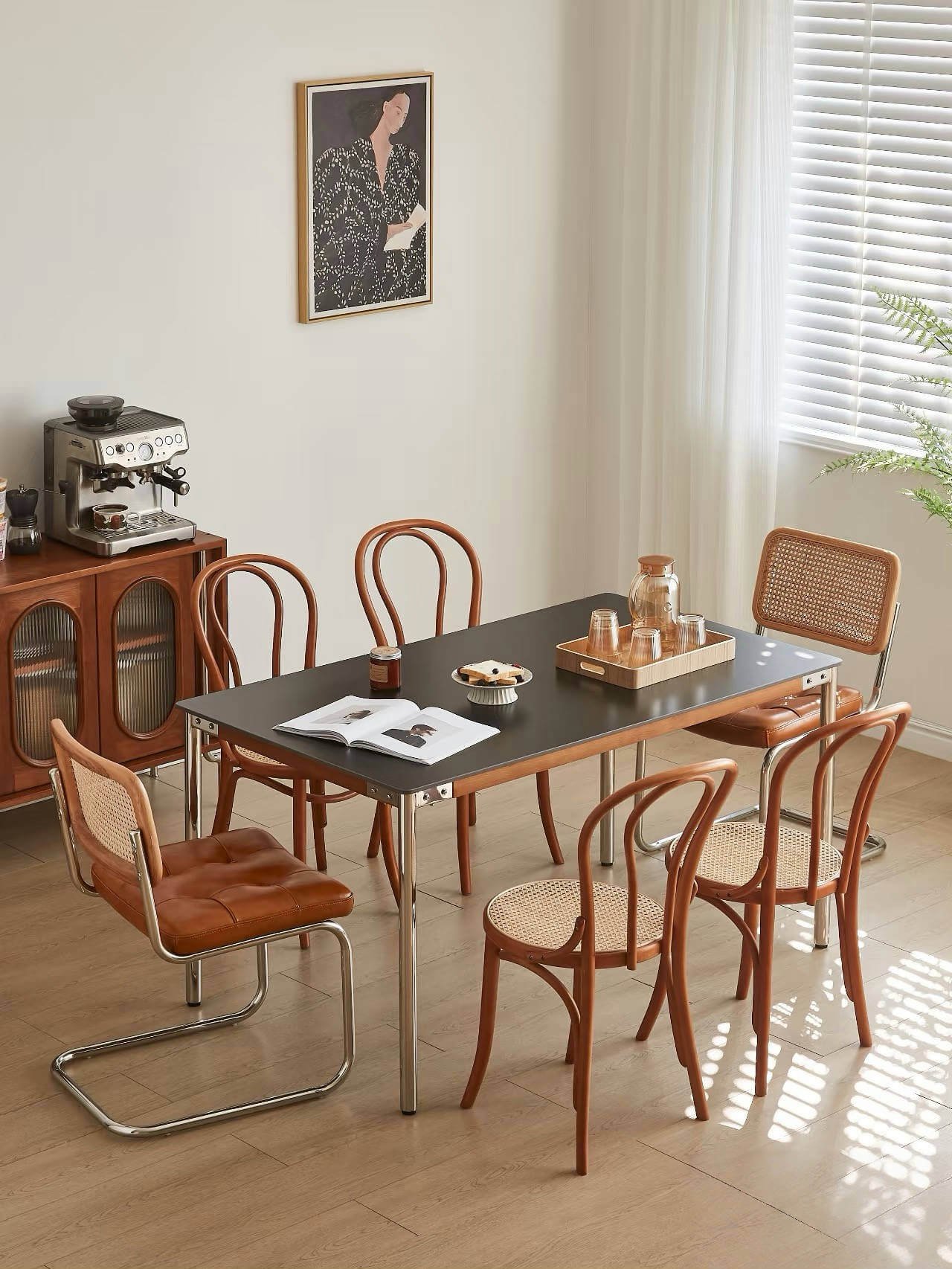 01 Elegant Matte Finish: The rock – slab tabletop has a matte finish that combines with the fine texture of solid wood. It’s smooth, delicate, and enhances the table’s elegance, avoiding the dullness of traditional glossy surfaces and making the dining table a stylish centerpiece.
