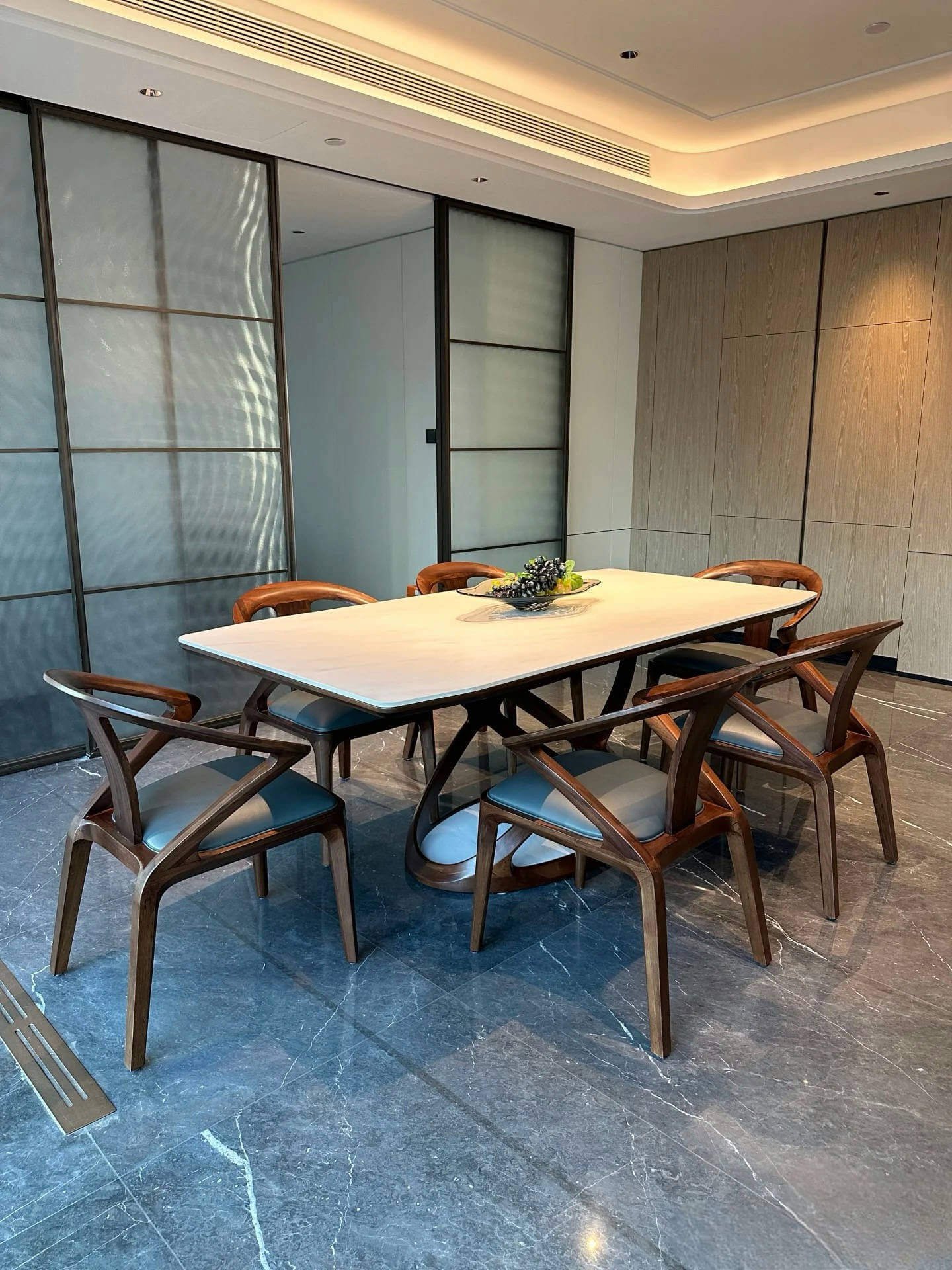 In the realm of modern home design, the interplay of materials shapes the essence of a space. This dining table, a fusion of North American black walnut and premium porcelain slab, initiates a profound dialogue between texture and lifestyle. The warm wood grain and the cool mineral sheen of porcelain create a timeless palette of greige and natural wood tones.