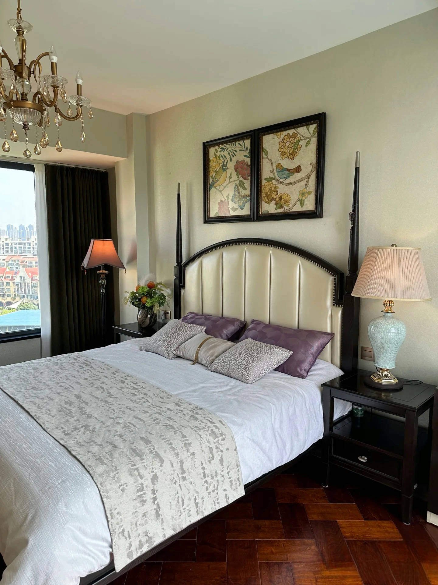 Now, the bedroom transcends being just a place to rest; it becomes a stage for stories. As night falls and lights come on, the chandelier’s brilliance, the lamp’s warmth, and the artwork’s subtle presence all combine. Reclining on this unique bed feels like a dance through time, connecting with the elegance of the past and the luxury of the present. Each return home becomes a romantic rendezvous with this vintage yet luxurious bedroom.