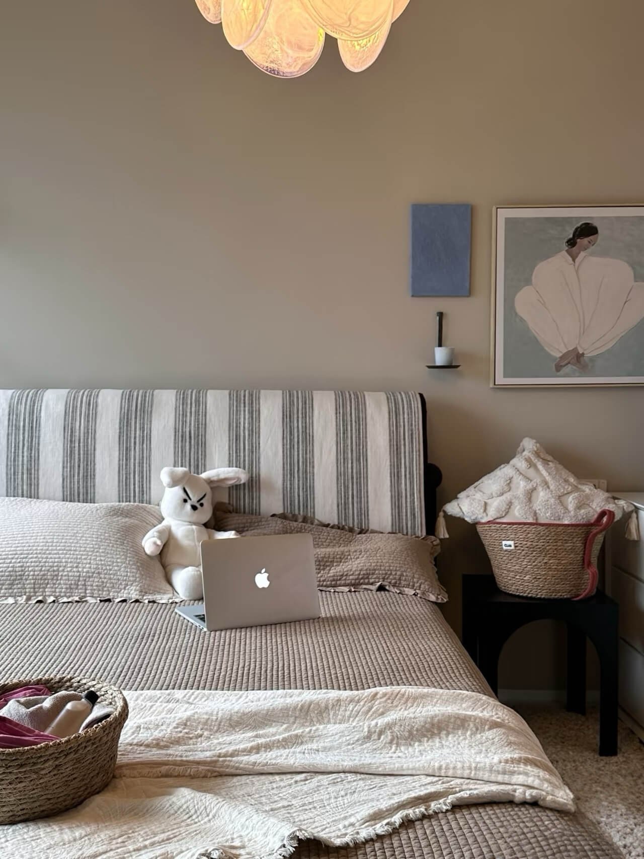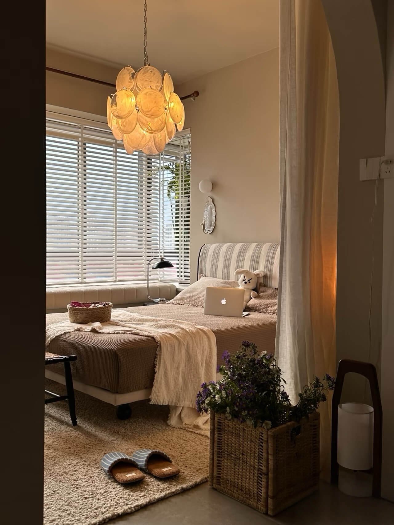 The bed, dressed in natural cotton and linen, invites you to nestle in with its soft, breathable fabric. This natural material not only provides comfort but also ensures good air circulation, making it perfect for a restful night’s sleep or a lazy afternoon snooze. Beside it, a plush rug adds an extra layer of warmth and texture to the room. Its soft fibers underfoot create an inviting path from the bed to the rest of the space, enhancing the cozy vibe.