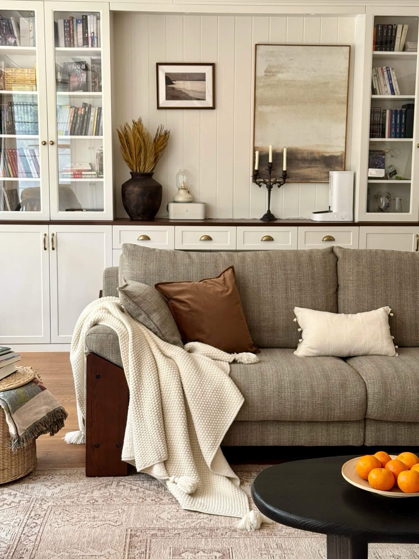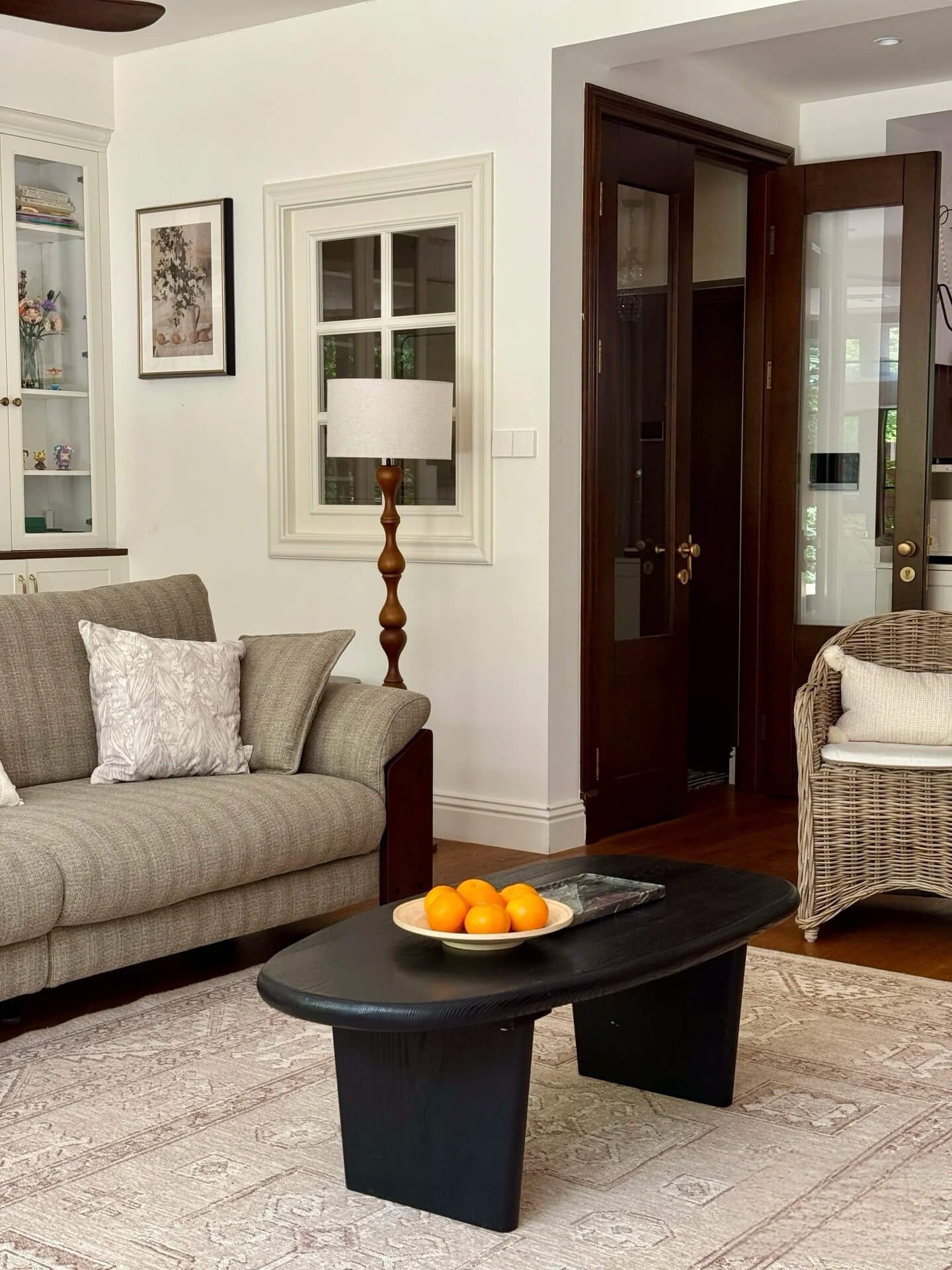 The ash sofa grows brighter with use; the linen starts to pill; the black skirting carries thin cat scratches—we left them untouched. Suddenly we understood: