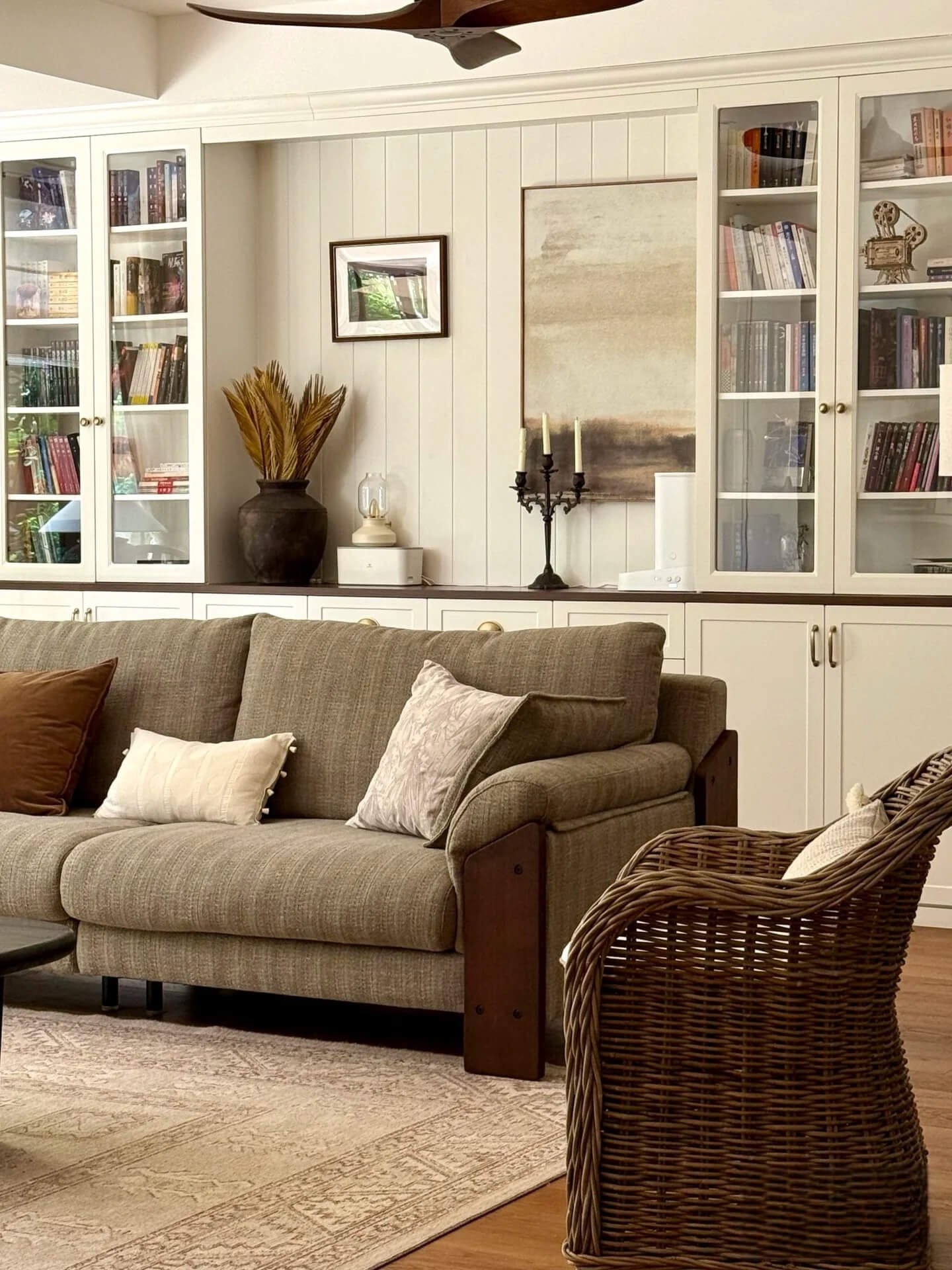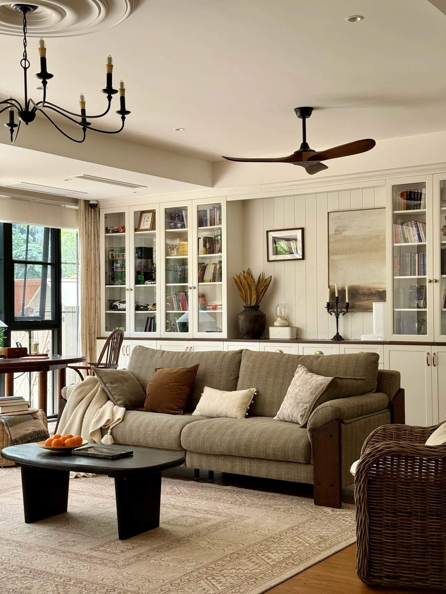 The rule is simple: anything new must look as if it had a previous owner. So we skipped the mainstream sofa and commissioned a local atelier to build an ash-wood frame upholstered in coarse-woven linen. Seat depth: 68 cm; the moment you sink in, you smell your grandma’s attic. Beside it stands a 1960s Danish cane chair—deliberately keeping the slight cracks in the cane as a time-stamp.